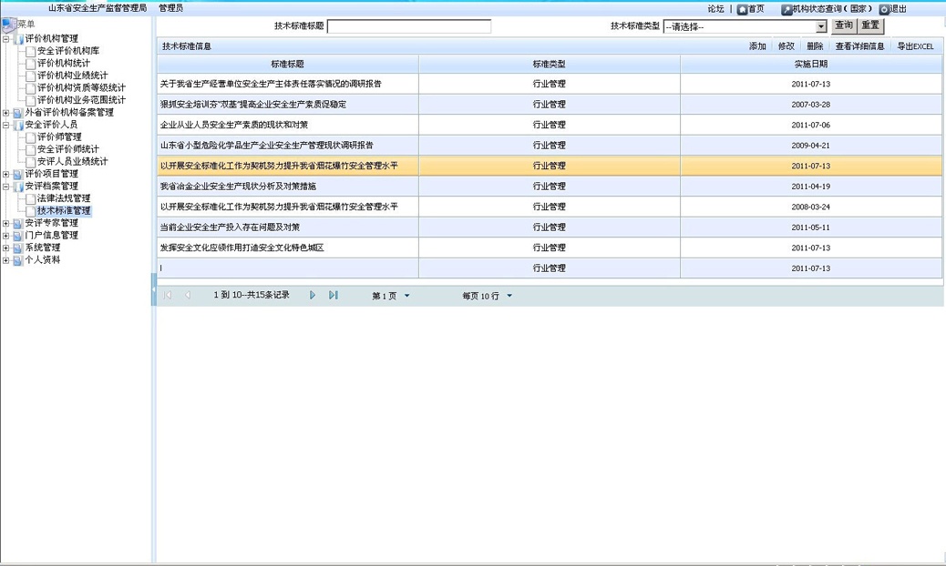 依據(jù)安全評價過程控制上報的數(shù)據(jù)對安評機構業(yè)績、安全評價人員業(yè)績進行智能統(tǒng)計匯總,并上報至國家安監(jiān)局??筛鶕?jù)安全評價機構、年份、安全評價人員等條件進行查詢,查看、導出、打印安評機構或安全評價人員的業(yè)績表;可以統(tǒng)計分析比較各安評機構的業(yè)績,為安全評價機構的定期考核提供依據(jù)。