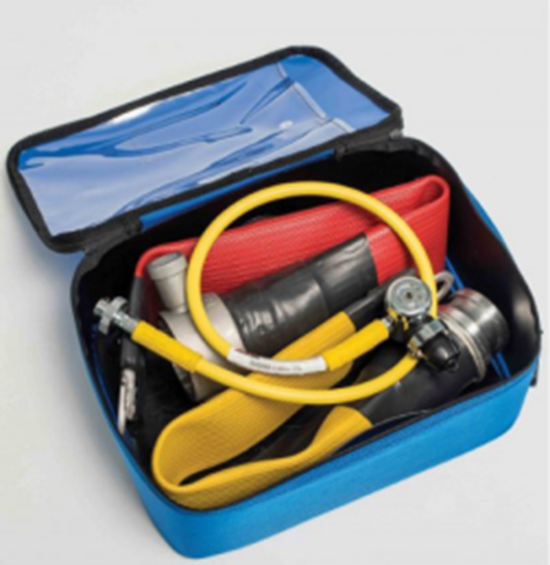 充氣管道救援套組的設計和開發(fā)旨在提供一種簡單而有效的方式,使用標準長度的消防水帶提供下游安全吊臂或浮動救援輔助設備。充氣管道救援套組充氣系統(tǒng)可使消防水帶兩端密封,尾部帶2個密封件,公頭末端為黃色,以便清晰識別并在使用時增加可視性。該系統(tǒng)的工作壓力為1.5巴,并使用系統(tǒng)提供的充氣套件進行充氣,該系統(tǒng)配有預設3.5巴的壓力調(diào)節(jié)器。母頭的尾巴