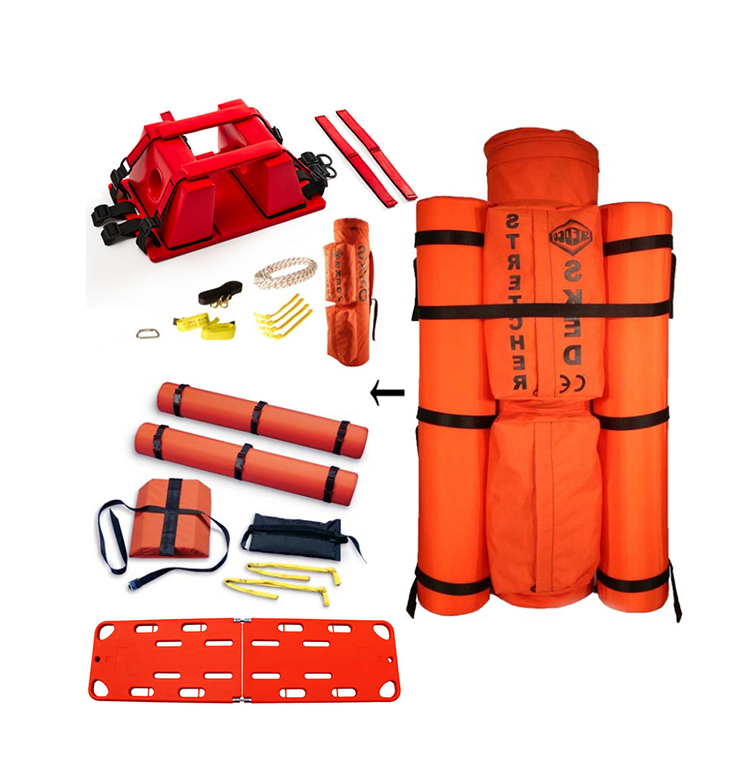 可漂浮救生擔(dān)架材質(zhì):柔韌塑料制成,強(qiáng)度高、耐磨性??捎糜谒婢仍蜕降鼐仍豢杉釉O(shè)固定扁帶,可防止拖拽造成損壞。高強(qiáng)度把手8個(gè),工作負(fù)載:400kg,內(nèi)置平板式可拆卸浮力輔助系統(tǒng)和脊柱板固定系統(tǒng),方便固定傷員,配備:梅隴鎖1個(gè)(主軸拉力45kN、橫軸拉力8kN)、鋼制梨型鉤4個(gè)(主軸拉力36kN橫軸8kN)、垂直豎井提升繩1套、浮力輔助部件和脊柱板一套。擔(dān)架浮力:1.6kN。