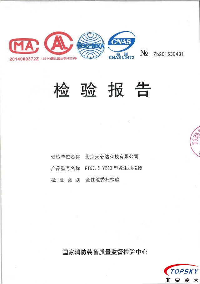 PTQ7.5-Y230型氣動遠距離救生拋投器取得消防檢測報告。