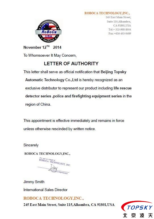 北京凌天成為美國ROBOCA公司在亞太區(qū)的總代理, 美國ROBOCA公司是反恐,救援裝備的制造商,主要產(chǎn)品包括氣動支撐系統(tǒng),雷達(dá)生命探測儀,排爆機(jī)器人等.