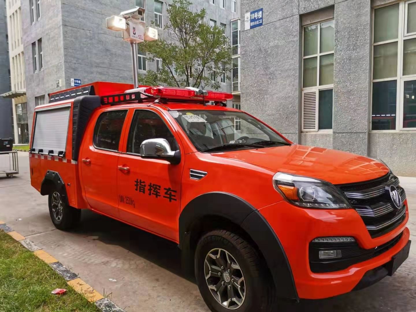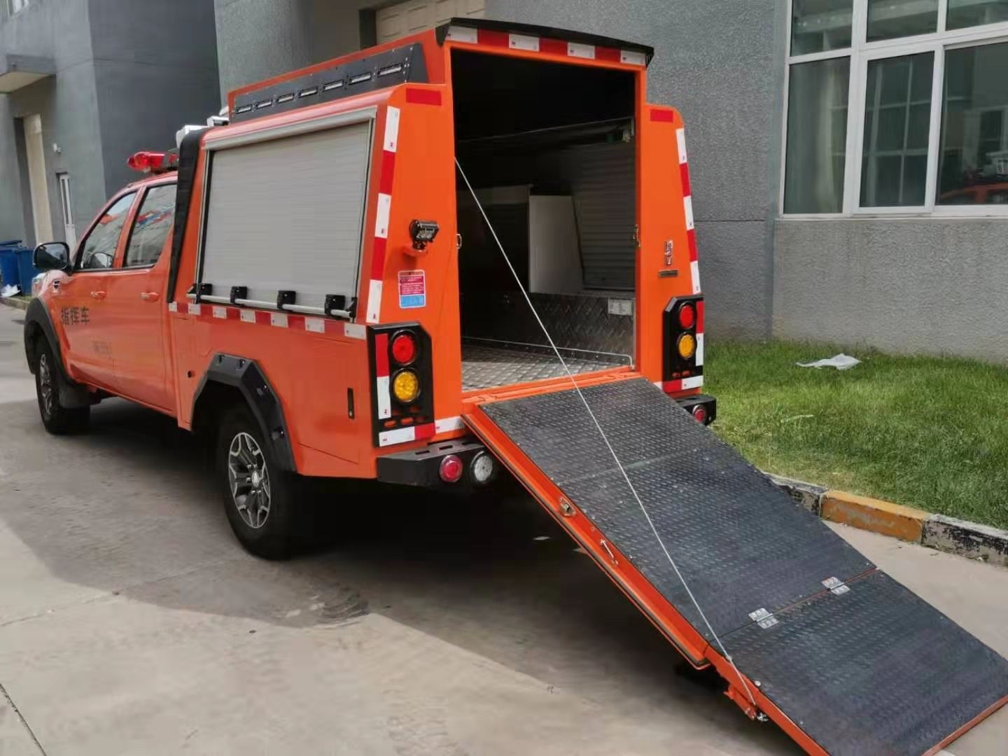 專門為特種機(jī)器人量身定做的一款機(jī)器人運(yùn)輸車,由皮卡車改裝,區(qū)別于傳統(tǒng)意義上大型運(yùn)輸車,體積更小,動(dòng)力更足。車廂設(shè)計(jì)有升降照明系統(tǒng),解決了救援現(xiàn)場(chǎng)能見度低的問題,1.2-1.8米升降高度,可滿足不同照明需求。車體頂部裝有4G圖像傳輸系統(tǒng),可將現(xiàn)場(chǎng)情況實(shí)時(shí)傳輸?shù)街笓]部,有利于指揮現(xiàn)場(chǎng)調(diào)度。配有一體化機(jī)器人裝運(yùn)梯,最大承壓≥600Kg。后箱四周配有一圈小型照明系統(tǒng),可用于晚間或光線昏暗等環(huán)境。后箱設(shè)計(jì)有獨(dú)立儲(chǔ)物架,可放置機(jī)器人配套設(shè)備。兩側(cè)卷閘窗設(shè)計(jì)方便拿用。