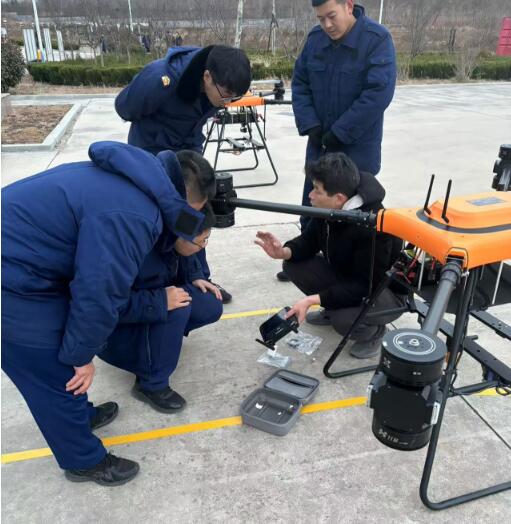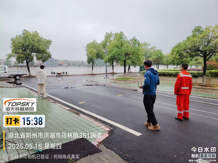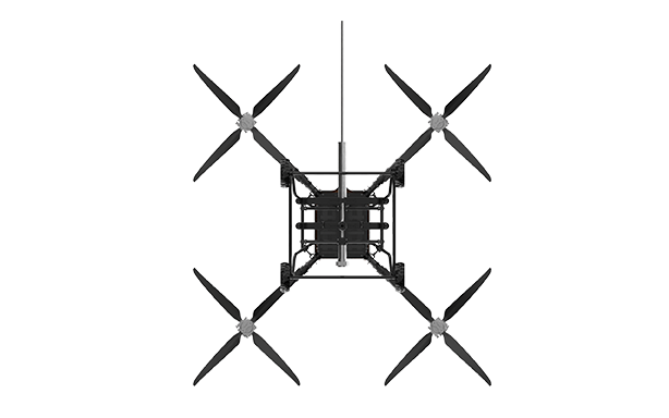 該無人機可裝載在消防車上,能快速啟動升空,通過特制高壓水帶與消防車水罐連接,消防車水罐內(nèi)部高效泡沫/水基滅火劑輸送到無人機平臺,在水槍噴口水平噴射出去,達(dá)到滅火的效果。