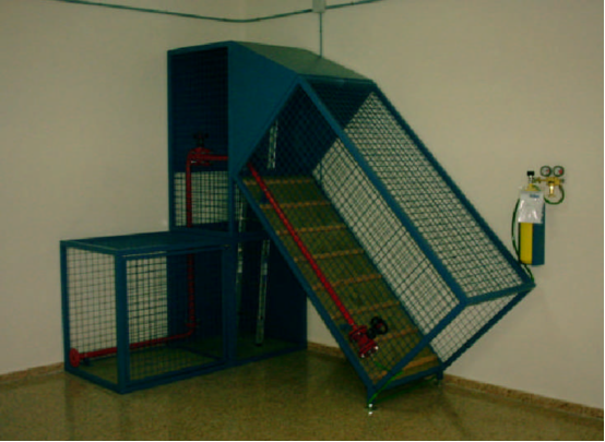 此裝備可以模擬各類尺寸偏小的坡度可變的巷道(0-45度),巷道內(nèi)行進方式為爬行或者側(cè)行根據(jù)巷道擺放形式不同,內(nèi)部采用摩擦系數(shù)較大的塑膠鋪成,方便人員行動。外側(cè)有手扶爬梯,人員在下部進入上部走出進行計量,可以自動計算人員規(guī)定時間內(nèi)的行走次數(shù)。