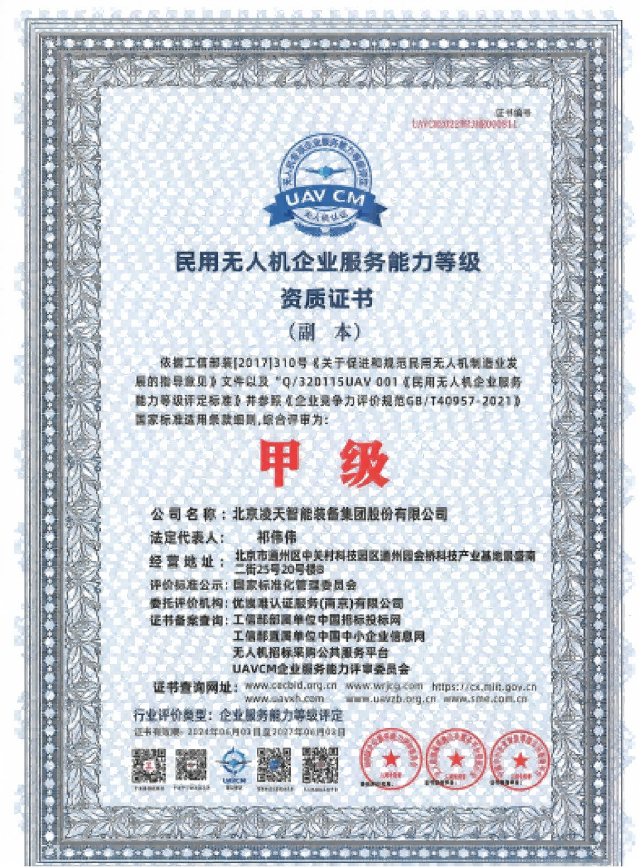 資格類民用無人機(jī)企業(yè)服務(wù)能力等級(jí)資質(zhì)證書(甲級(jí))